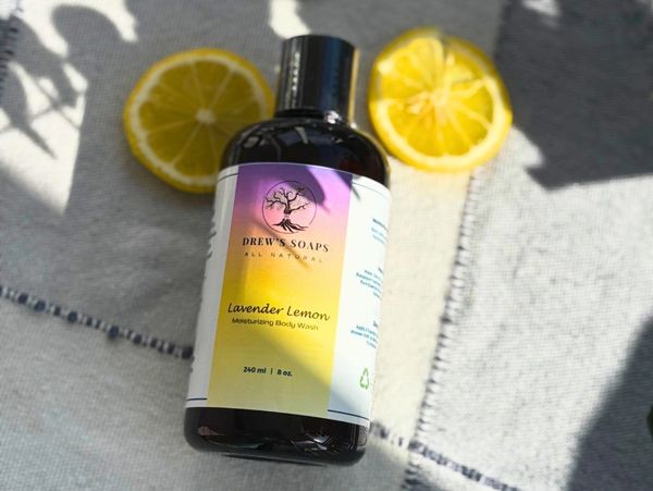 Drew's Soaps Moisturizing Body Wash delivers a rich, creamy lather that cleanses while hydrating your skin. Made with coconut, olive, and castor oils plus Vitamin E, this gentle formula is free from harsh chemicals. Each batch is infused with organic essential oils for naturally uplifting aromas that will transform your shower into a spa-like experience. Handcrafted with care our body wash leaves your skin nourished, refreshed, and irresistibly smooth!